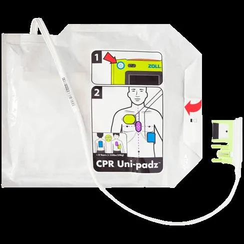 Universal Adult or Child Electrode Pads Chest sensor includes Real CPR Help real-time feedback for depth and rate of compressions during CPR 5 year shelf life Rescue kit: Includes gloves, scissors, razor, barrier mask, wet/dry wipe